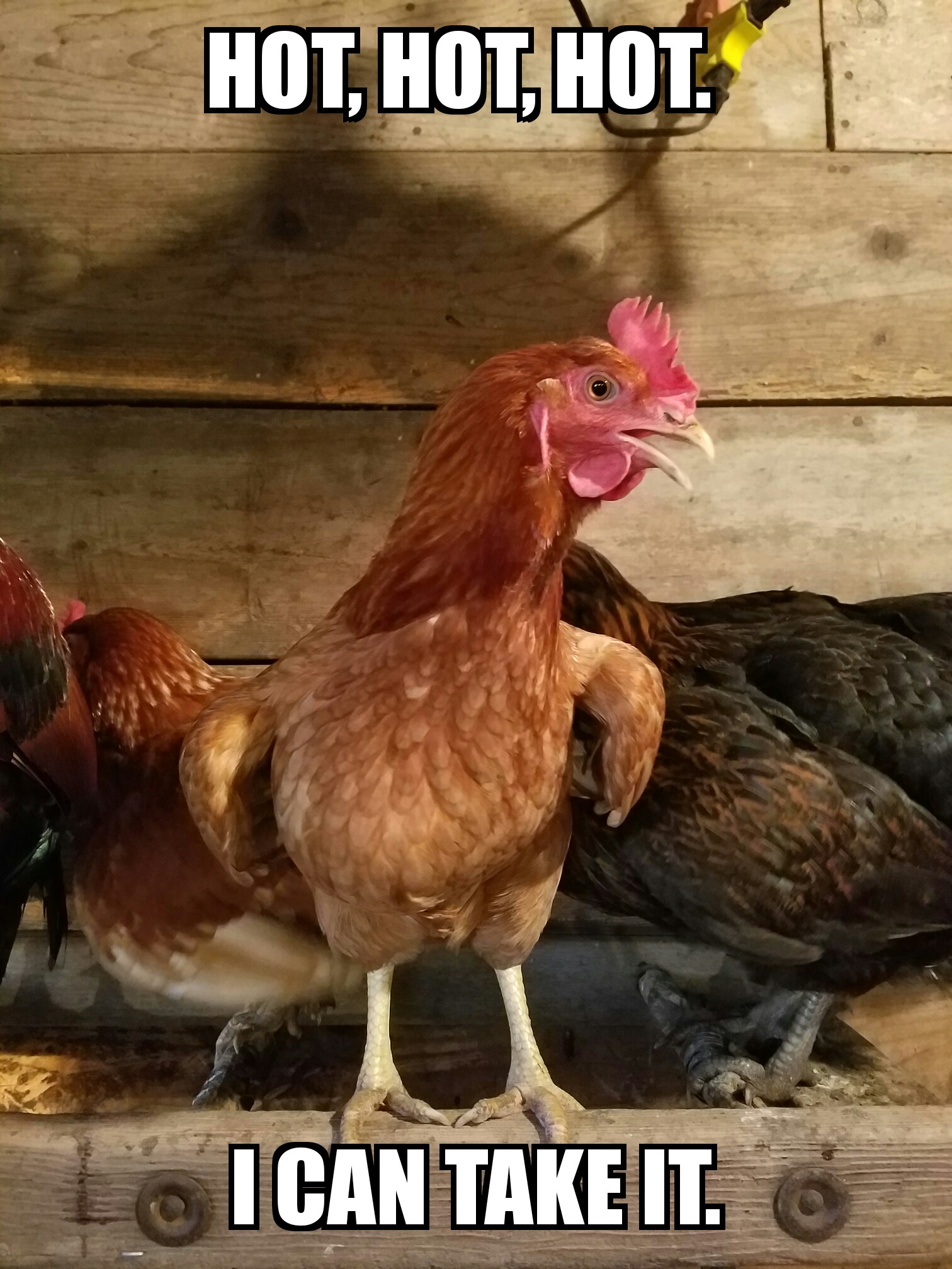 We have definitely had our share of hot muggy August summer days lately and the poor chickens have been trying to find some relief.  In case you have ever wondered what a hot chicken looks like, here is one of my hens demonstrating the necessary pose.
