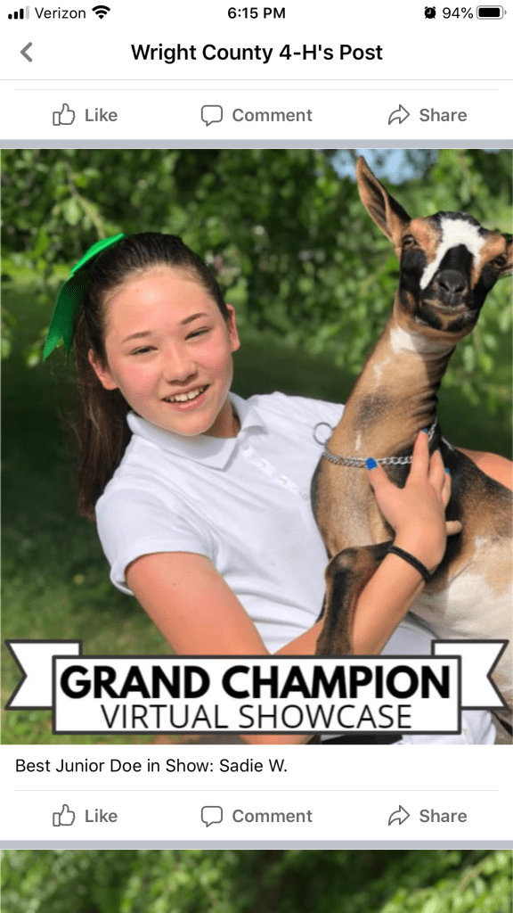 This year with everyone canceling in person fairs, Sadie experiences a virtual livestock showcase and was excited to take first and second and a virtual trip to the state level. we are not sure what it will like like at the state level but we are excited to be a apart of the journey. We also had a surprise that Wright County showcased Sadie in their brochure.